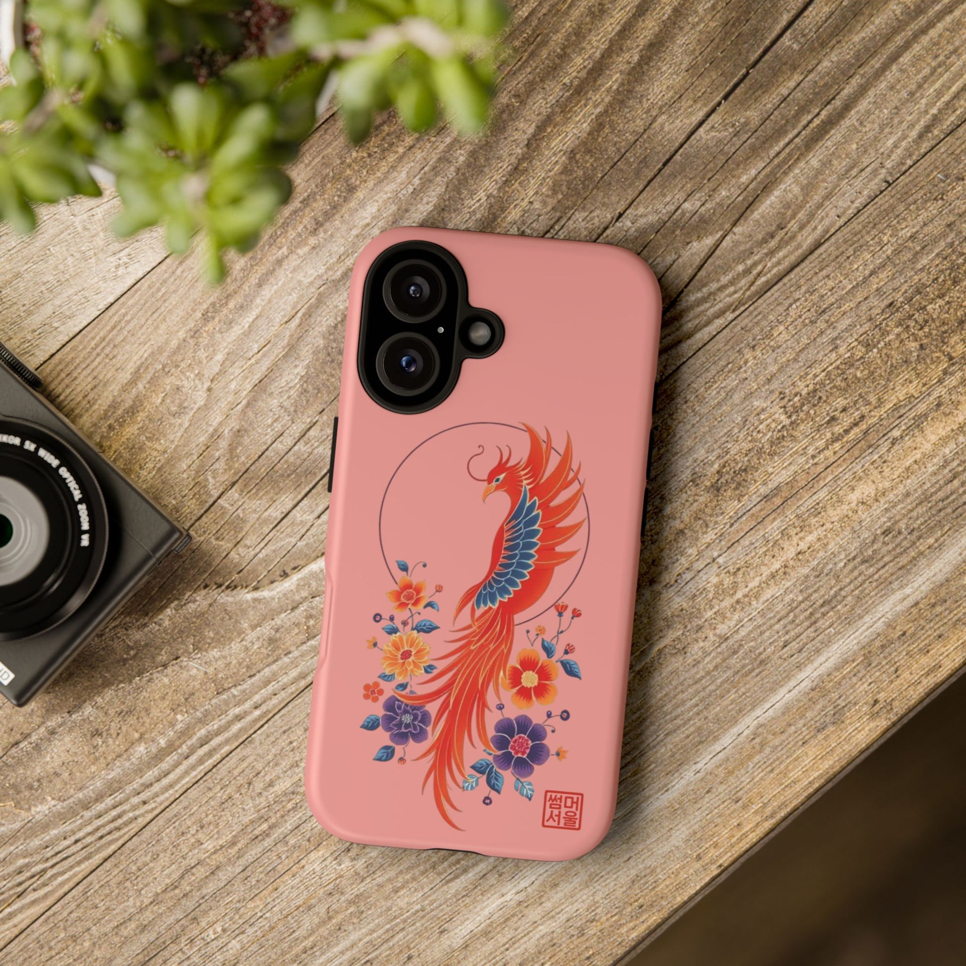 Mythical Beauty, Bold Protection. The Phoenix Bloom Tough Case features the elegant bonghwang — Korea’s mythical phoenix — rising amid blooming flowers in vibrant, traditional hues. Set against a bold coral-pink backdrop, this design balances cultural richness with everyday resilience.